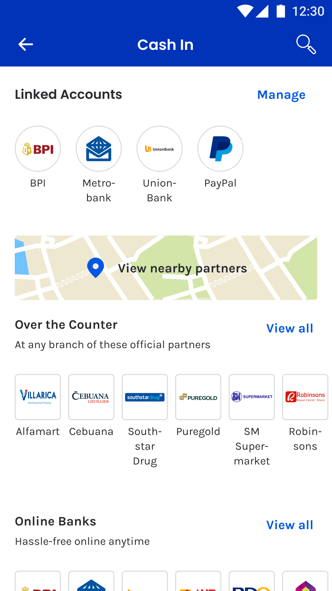 This is the local banks tab. Users can see which banks they can Cash In with, as well as alternative methods to Cash In with banks not found on this list.