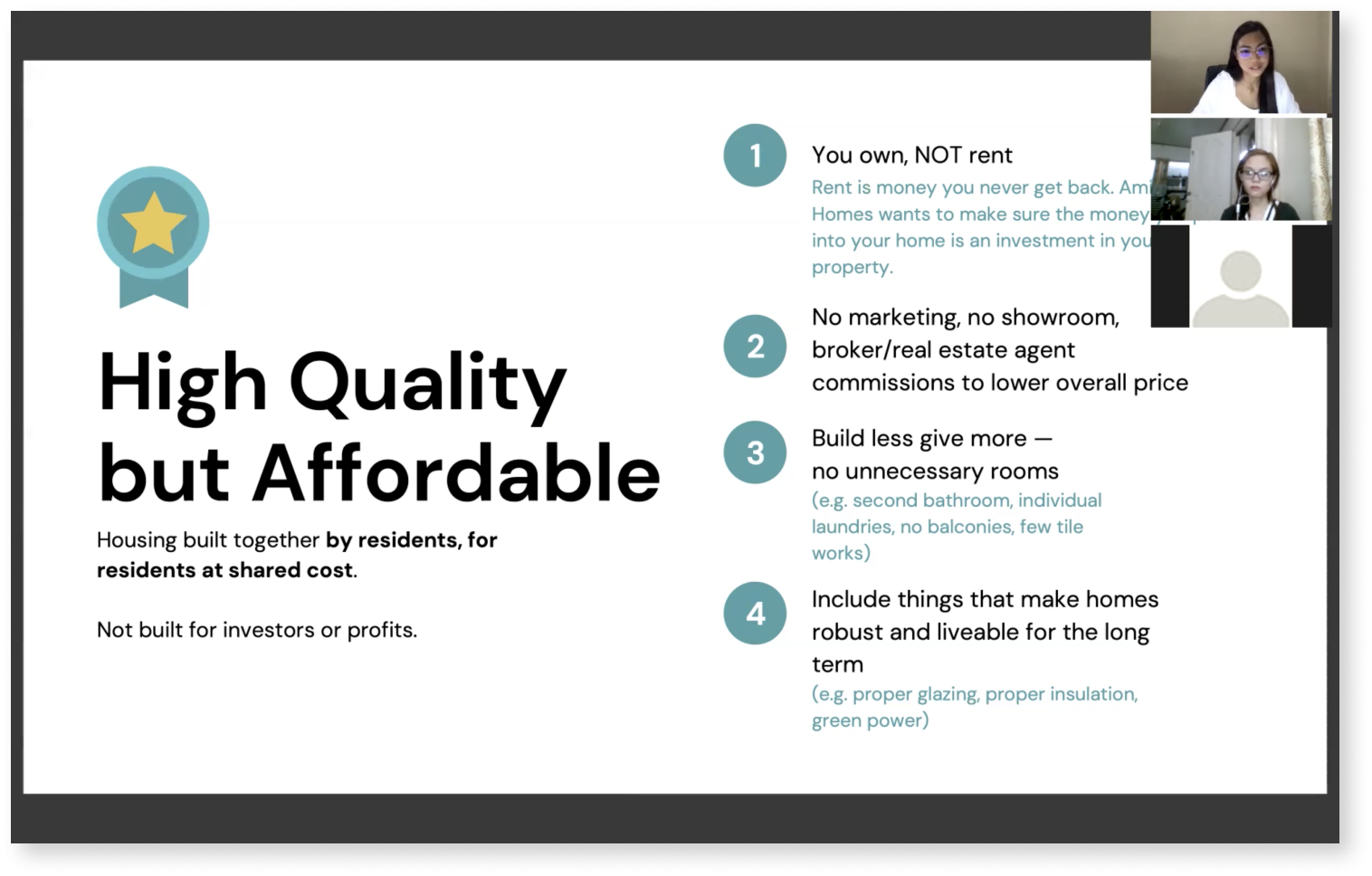 Throughout the user interviews, I presented a few mini-decks that explained what the development was and how its homeownership model worked.